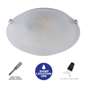 The 15.75-inch flush mount features a low-profile design with a stylish alabaster glass bowl shade, perfect for complementing both traditional and modern interiors. This mid-size fixture accommodates two 60-watt bulbs, providing warm, even illumination for large rooms and hallways. The soft glow diffuses through the alabaster glass, while brushed nickel-finished metal support clips add a sleek, contemporary accent. Rated for damp and dry locations, this ceiling light is ideal for covered porches, kitchens, dining rooms, bedrooms, and hallways.