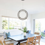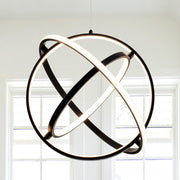 The sufficiently modern LED chandelier plays well with negative space. It consists of a three-layer circular frame built from aluminum in black finish, each circle intersecting with rods. The two circles in the middle can be rotated to create different layered, globe silhouettes and striking shadow patterns. This fixture is designed with an integrated LED light all around the frames that casts a warm, ambient glow above your kitchen island or in your dining room. This chandelier is suspended by a slim-down rod, and it's held in place with a round ceiling mount. Plus, it's dimmable to get the lighting you want.