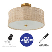 Natural Boho Design: Elevate your home decor with this semi flush mount light featuring a woven rattan shade and a stylish brass finish. The organic texture and warm tones bring a relaxed, bohemian charm to any space.