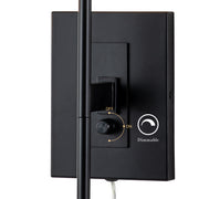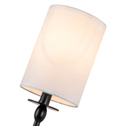 Add modern style to seating areas or bedrooms with this wall lamp. Easy to install, the fixture can be hardwired or plug in, adds instant style and light to any setting. The set features a streamlined modern profile with white fabric drum shades. The wall plate and top arm come in a black metal finish. An on-off dimmer switch on the plate gives you easy lighting control.