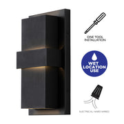 A multi-dimensional and versatile design, the modern LED wall sconce fits all of your lighting needs. Features an aluminum sculpted box in matte black with a tiered design to showcase its craftsmanship, for a tiered, architectural ambience. Powered with modern LEDs, the light shine throught retangular opening, bounces off the matte black bar, being further distributed, to illuminate your outdoor space with a gentle glow. Illuminating up and down light with 50,000 hours of rated life, the wall light provides a unique look and high style appeal for residential, hospitality, and office applications.