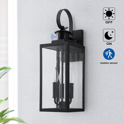 View full details1-Light Matte Black Motion Sensing Dusk to Dawn Outdoor Wall Lanten with Clear Seeded Glass Cylinder