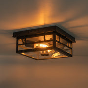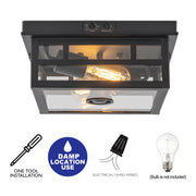Enhance your outdoor spaces with this modern flush mount ceiling light, featuring a motion sensor and dusk-to-dawn technology for enhanced security and energy efficiency. Designed with a sturdy black metal frame and clear glass panels, this light provides a bright, welcoming glow while complementing a variety of home styles, including farmhouse, industrial, and modern aesthetics. The built-in motion sensor detects movement, turning the light on automatically when needed, while the dusk-to-dawn function ensures hands-free operation by turning the light on at night and off during the day. Weather-resistant construction makes it ideal for porches, patios, garages, and entryways, providing long-lasting illumination and security.