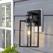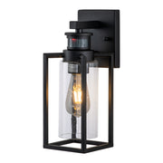 1-Light Matte Black Motion Sensing Dusk to Dawn Outdoor Wall Lanten with Clear Seeded Glass Cylinder
