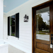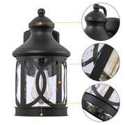 This traditional style outdoor wall light adds charming detail and a welcoming glow to your home. Featuring a swirled top, curvaceous shape, and O overlay, this outdoor wall sconce comes in a black finish with a clear seeded glass shade. Its frame provides additional visual interest with a combination of scrolling and linear details. The lantern provides illumination to your patio, deck or front entrance with style.
