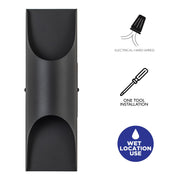 Unique and modern from the inside out, this outdoor wall light will illuminate your outdoor living space with a truly contemporary approach. The wall sconce is a generally rectangular fixture, made of metal in powder-coated black to withstand harsh weather conditions. A curved panel on the front hides integrated LEDs and directs the light they produce up and down, highlighting both the wall light’s own interior surface as well as the texture of the surrounding wall. The gentle ambiance the outdoor light created is ideal near an entry or along a porch.