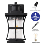 This wall sconce blends industrial modern with elegant vintage elements. Featuring a curved hook and classic matte black mesh frame with a seeded glass shade, it transmits a soft, charming light to add beauty to your outdoor room and complement a variety of home décor. Built-in sensitive PIR motion activated and IC light sensors, providing safe lighting while saving energy, making it an ideal choice for your backyard,porch, garage, and front door.