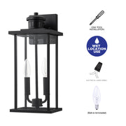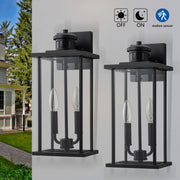 Elevate your outdoor spaces with this 2-pack of wall lights. Featuring a timeless black finish and clear tempered glass panels, these lantern-style fixtures create a welcoming ambiance. With motion sensing and dusk-to-dawn functionality, they are perfect for porches, patios, garages, or entryways, offering both convenience and hands-free operation. Built to endure the elements, these durable lights combine practicality with classic design, making them an ideal addition to any outdoor area.