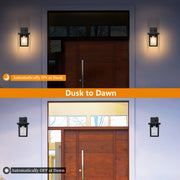 Upgrade your outdoor spaces with this 2 pack outdoor wall lights. Featuring a matte black finish and clear glass panels, these lights offer a stylish yet practical solution for patios, garages, and entryways. The durable metal frame and waterproof design ensure reliable performance in any weather.Equipped with a dusk-to-dawn sensor, these lights automatically turn on at night and off during the day, saving energy while enhancing security, perfect for patios, garages, and entryways,
