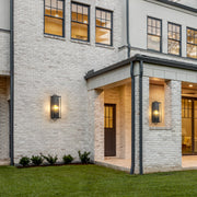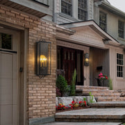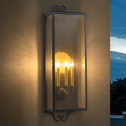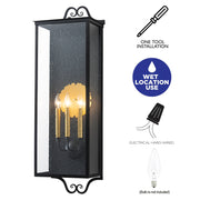 Elevate your outdoor living space with this elegant Black Outdoor Wall Lantern. Crafted with a sleek matte-black metal frame and accented by warm gold detailing, this lantern brings a sophisticated, transitional flair to any home exterior. The tall, rectangular silhouette showcases panes of seeded glass, which softly diffuses light for a welcoming glow. Inside, three candelabra style (E12) sockets cradle your choice of decorative bulbs (not included), evoking the charm of classic candlelight with the reliability of modern fixtures. Perfect for flanking entryways, illuminating porches, or accenting garden walls, this versatile lantern combines durable weather-resistant construction with refined style that complements both traditional and contemporary architecture.