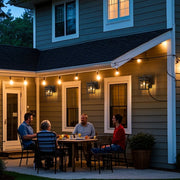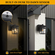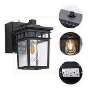 This outdoor wall lantern seamlessly blends a classic lantern design with modern advanced function, providing convenient lighting solution for your outdoor space. Equipped with a dusk to dawn sensor, it automatically turns on or off based on ambient light levels, saving energy and eliminating the need for manual operation. The built-in GFCI outlet provides a safe power source for outdoor devices, effectively preventing electrical leakage and ensuring user safety. Its durable, weather-resistant construction guarantees reliable performance in harsh weather conditions. Ideal for porches, garages, patios, and other outdoor areas, it combines functionality with aesthetic appeal to enhance any exterior space.