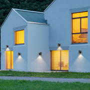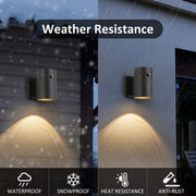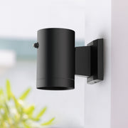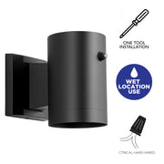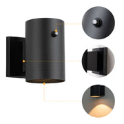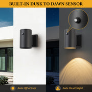 Add a modern yet functional touch to your outdoor lighting setup with this sleek black aluminum wall light. Featuring a cylindrical silhouette with a powder-coated black finish, this fixture seamlessly blends style and durability for contemporary exteriors. Built with an integrated dusk-to-dawn sensor, it automatically turns on at night and off at dawn, providing effortless energy efficiency and security. Designed with a standard E26 base socket, it offers bulb flexibility and easy replacement. This wall sconce is perfect for entryways, patios, garages, and garden walls—delivering both ambiance and illumination with a warm downward glow that enhances your home's exterior aesthetic and safety.