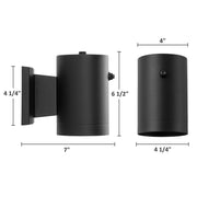 Product Dimension: The light fixture is W 4.25 in. x E 7 in. x H 6.5 in., the cylinder is D 4 in. x H 6.5 in., the backplate is W 4.25 in. x E 0.75 in. x H 4.25 in.