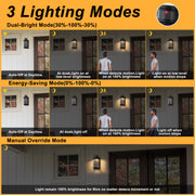 Three Modes: The fixture has dual-bright mode(Night Light ON), energy-saving mode(Night Light OFF), manual override mode. 3 modes can be exchanges by a power wall switch.