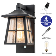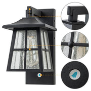 Blending contemporary and classic styles, the outdoor wall sconce is an easy way to brighten up your outdoor space. This elegant wall light embraces angles and square details, including a square hanging loop, for a fresh, modern appeal. Pairing clear seeded glass with a matte black finish adds subtle sophistication and classic touch. Combined outdoor light and doorbell function, built-in doorbell transmitter and configured with a plug-in receiver, convenient and safe for your life. It's perfect for a place by the back door, by the garage, or by the front entrance, this sconce will add light and flair to any outdoor space.