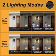 Night Light ON: Turn the switch to "High", the light will automatically turn on at low-level brightness(30% ) at dusk. When motion is detected, the light will turn to high-level brightness(100%). After 2 minutes, if there is no motion,the light will return to 30% brightness.