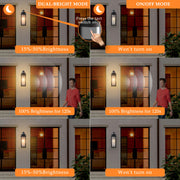 - Dual-bright Mode: At dusk, the light will turn on at low-level brightness(15%-50%). When motion is detected, the light will turn to high brightness(100%). It will revert to low-level brightness about 120s after motion stops. Until dawn, the lights turn off.
