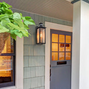 - Traditional Design: Inspired by traditional mission-style lighting, this outdoor wall light is a handsome addition to your porch or patio. It features a classic black finish and seedy glass panels that create a beautiful rain-washed effect.