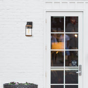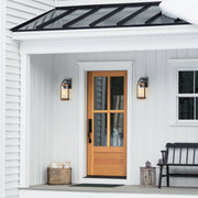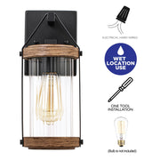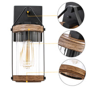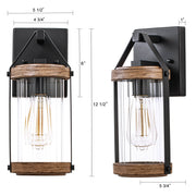 Add rustic charm and warm, welcoming illumination to your outdoor space with these outdoor wall sconces. Inspired by a traditional gas lantern, the light fixture features a clear cylinder-striped glass shade surrounded by a frame hung on the arm. The two-tone powder-coated black and woodgrain finish highlights the beauty of this traditional design. It exudes a vintage appeal that could be easily enhanced by an Edison bulb (not included). Ideal enhancement for traditional homes as well as modern-day outdoor settings, from farmhouse to retro-industrial, great for Front Porch, Patio, Garage, Deck, Balcony, etc.