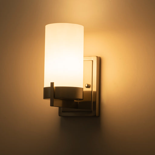 View full details1-Light Satin Nickel Wall Sconce with Frosted Glass Shade