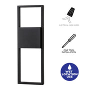 This outdoor wall light illuminates your porch or deck with a playful, modern aesthetic. Crafted from metal, it showcases a matte black finish that's weather-resistant, so it stands up to the elements. This light features an open, rectangular frame and a rectangular sconce with frosted glass that artfully diffuses the uplight and downlight. Integrated with energy-saving LED module and delivers 2000 Lumens of illumination. This outdoor light is rated for wet locations, making it the right lighting fixture to live outdoors and indoors.