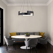 A clean contemporary LED styling combines futuristic design set the mood for a modern environment. Two layers of straight metal bands combine to form an asymmetric architectural appearance. The offset illuminated components create a dynamic lamp that changes visually depending on your viewpoint. Hang this modern styled pendant by itself or in a grouping over a kitchen island, in a home office or over a dining room table.